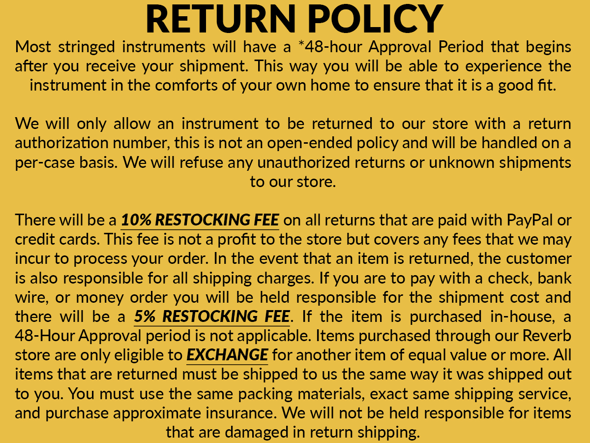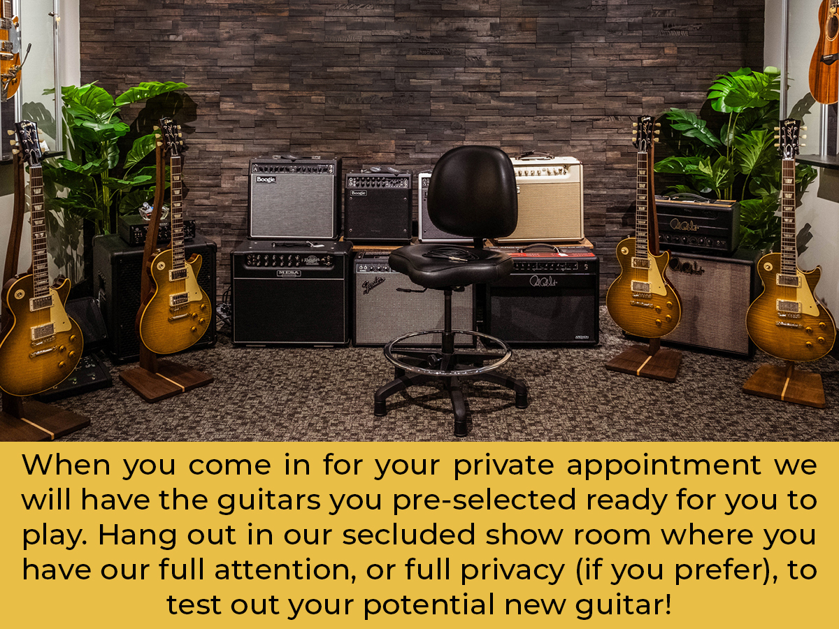 We know that finding the perfect guitar is no simple task, and we want you to have one-on-one attention from our experienced staff. Being able to prepare ahead of time by having the desired instruments or equipment ready for you to try creates a much smoother process, and should you find the guitar you thought you wanted doesn’t play as expected, we want to be available to recommend other options.